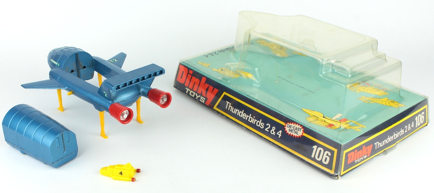 Dinky 106 Thunderbirds 2 & 4. Near mint plus/boxed (bubble pack issue). Version with YELLOW LEGS. QDT starting bid £160. Please note that QDT apply 12.5% buyer's commission. From The East Coast Collection.