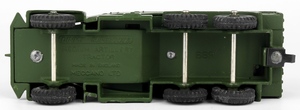 This classic military item from 1957 (Dinky stamp inside the box lid) has an original matte military green finish, two spare tyres stowed and a well-shaped detachable tin tilt. Driver figure.
