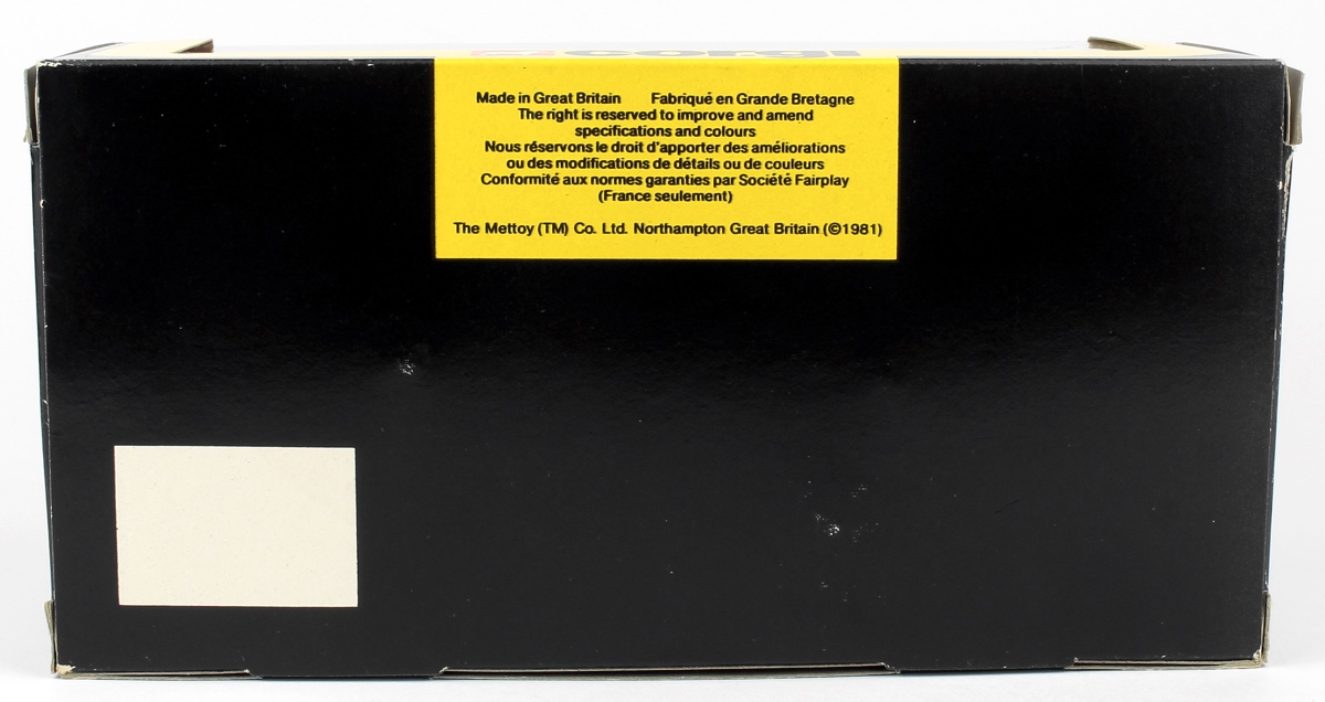 A fine example of this later issue James Bond Aston Martin from 1981, finished in bright metallic silver with a red interior. This example is in pristine condition and does not look as if it has ever been removed from the orange and yellow card insert. Indeed the box looks as if it has rarely been opened.