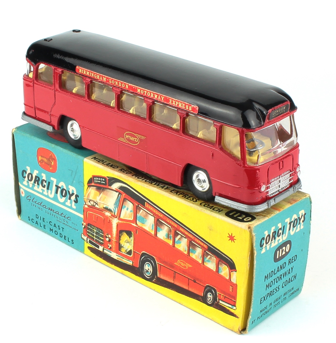 Corgi 1120 Midland Red Motorway Express Coach. Very near mint/boxed. Scarce late issue with shaped spun wheels in the END FLAP style box. From The Pennsylvanian Collection.