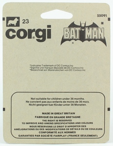 Corgi Juniors No. 23 Batman on his Batbike. Batman reaching forward version on card. Mint/boxed. From The Husky & Corgi Junior Section of The Monty Calme Collection. QDT starting bid £75. Please note that QDT apply 12.5% buyer's commission.