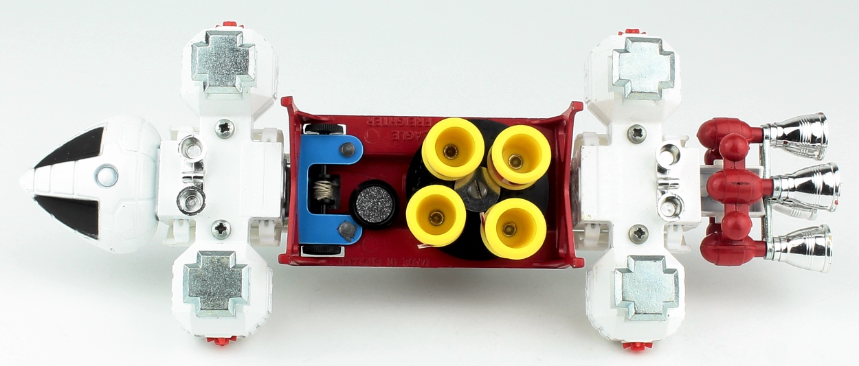 Issued between 1975-79, this model was inspired by the T.V. Series ‘SPACE 1999’. In complete and original condition, finished in red and white, with all four radioactive drums (labels are complete and fresh-looking). Chrome details are fine. Note this is the scarce issue with red and chrome details reversed at the rear.