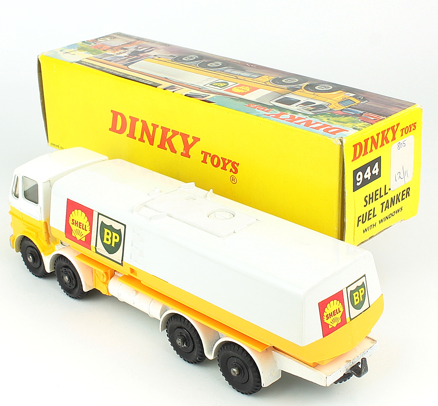 Dinky 944 Shell-B.P. Fuel Tanker. Very near mint/boxed (end flap style). White chassis version with BLACK WHEELS & TYRES. From A Phenomenal Collection.