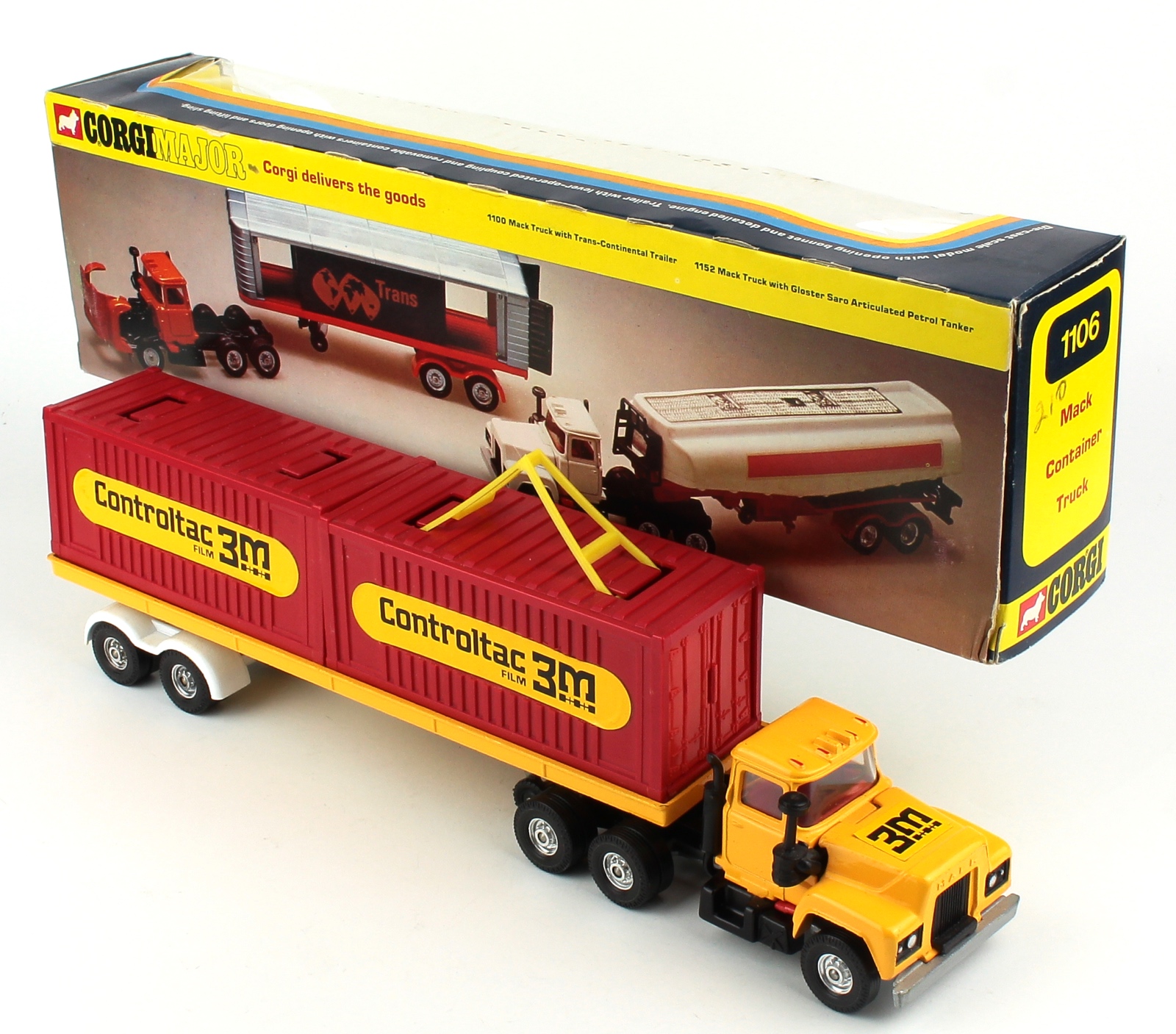 Corgi 1106 Mack Container Truck & Trailer. Very, very near mint/boxed. Rare promotional issue 'CONTROLTAC 3M'. From The West Midlands Collection. Starting bid £250. Please note that QDT apply 12.5% buyer's commission.