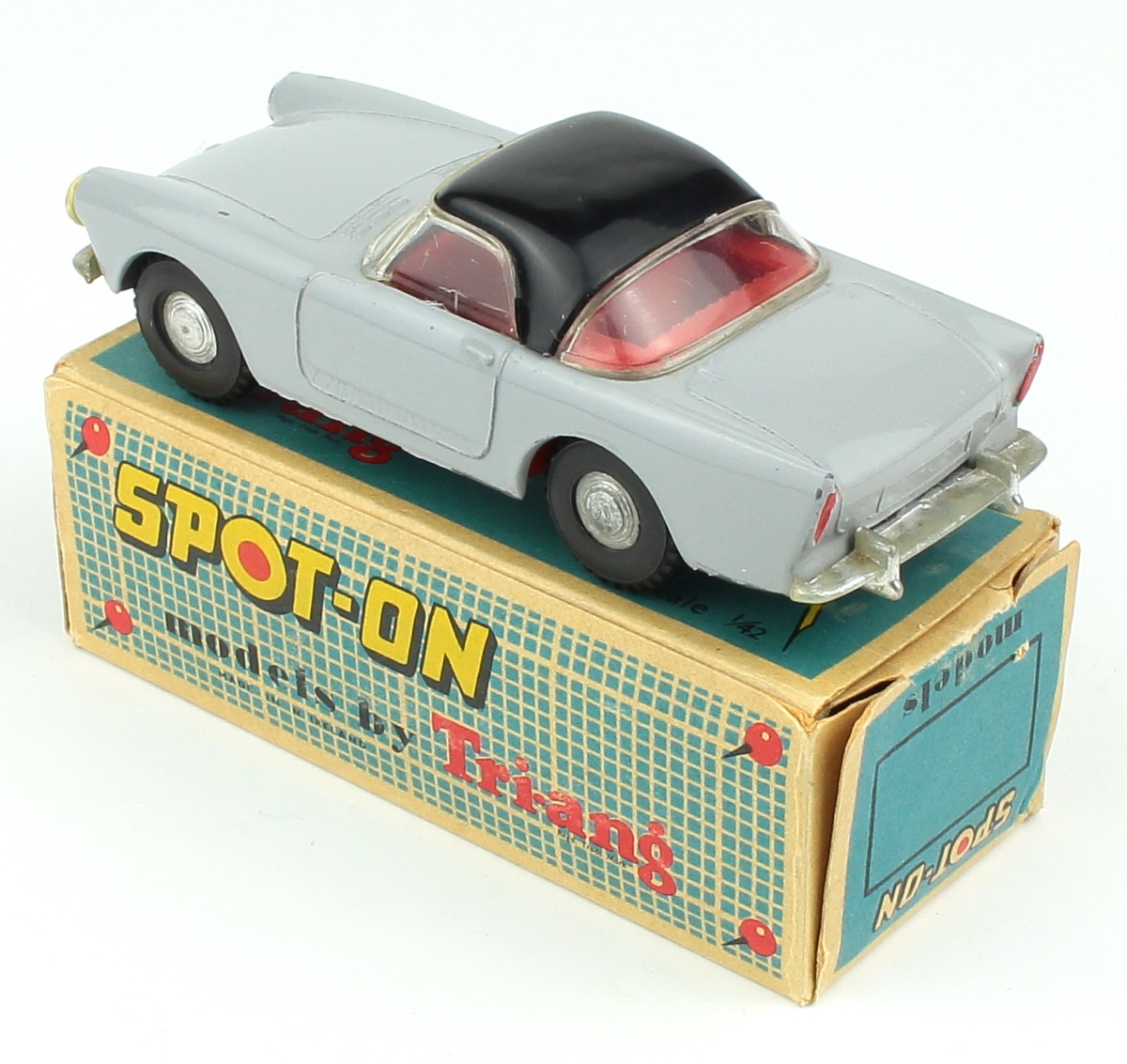 Issued during 1963 by the respected Spot-on manufacturer in strictly 1:42 scale. This version is finished in light grey (more often found in deeper grey) with a black roof. Red interior, white steering wheel. Shiny spun wheels and well-shaped, supple tyres.