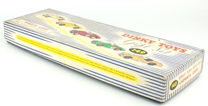 The instantly recognisable striped DINKY TOYS lid with all five cars pictured, has strong crisp colours on intact card. No graffiti unless you count the shopkeeper’s period price (16/3). Some storage grubbiness and light wear. No tears or repairs.