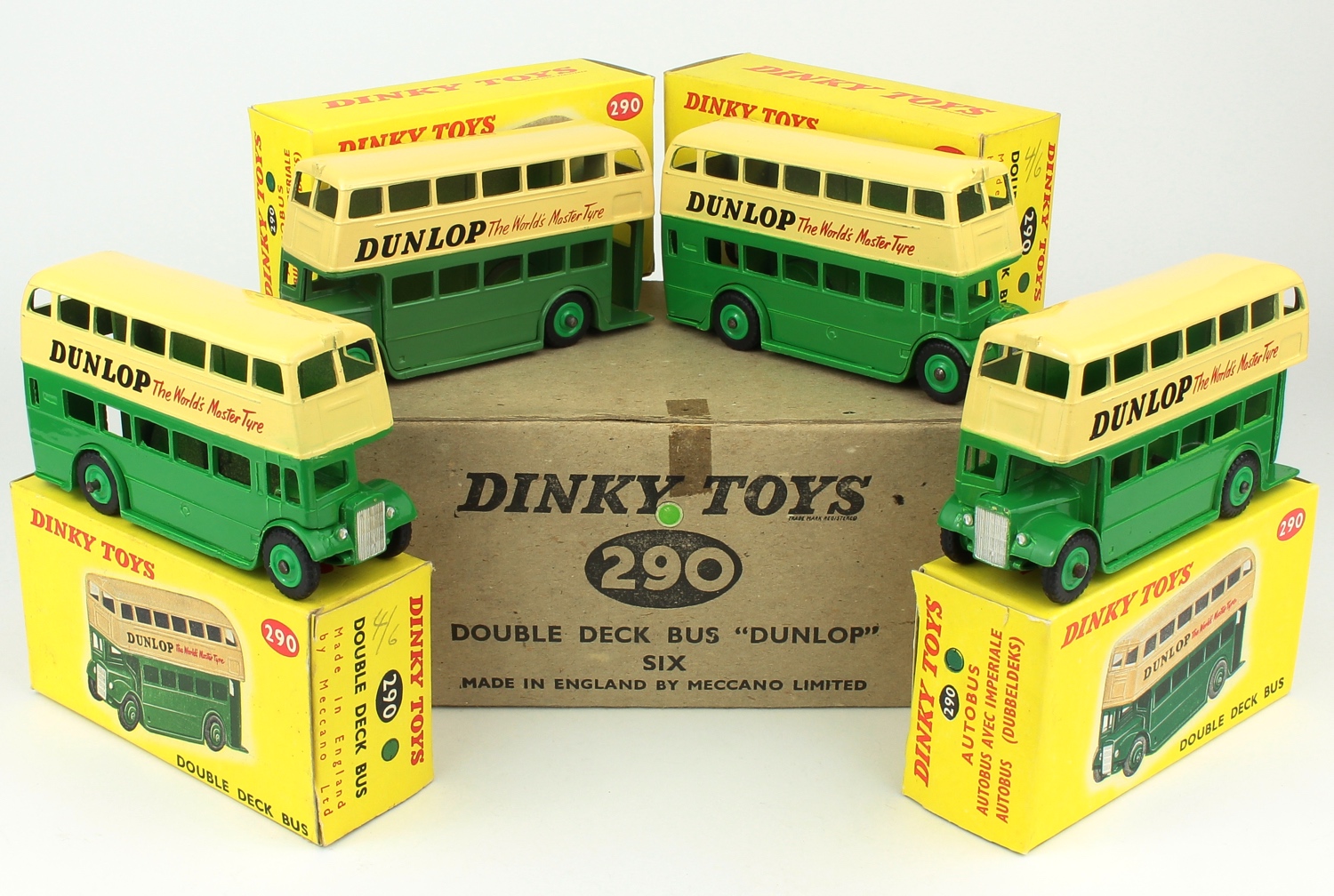 Shopkeeper's Trade Box of 4 x Dinky 290 Double Deck Bus 'DUNLOP'. Dinky Factory Stamp 1962. Very near mint - very , very near mint/boxed. Scarce versions in GREEN & CREAM with GREEN PLASTIC WHEELS! Three include the original PERSPEX Packing Strips. Another first for QDT. From The Nelson Collection.
