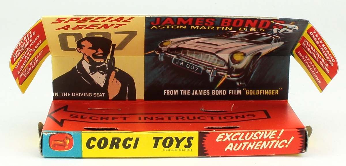 The 2nd issue outer box impresses with vibrant colours on crisp, silky card. Tiny wear. Note that since it is 2nd issue, there is shading detail around the lettering ASTON MARTIN DB5 on the box face and a thick black border around the JAMES BOND’S lettering, too.