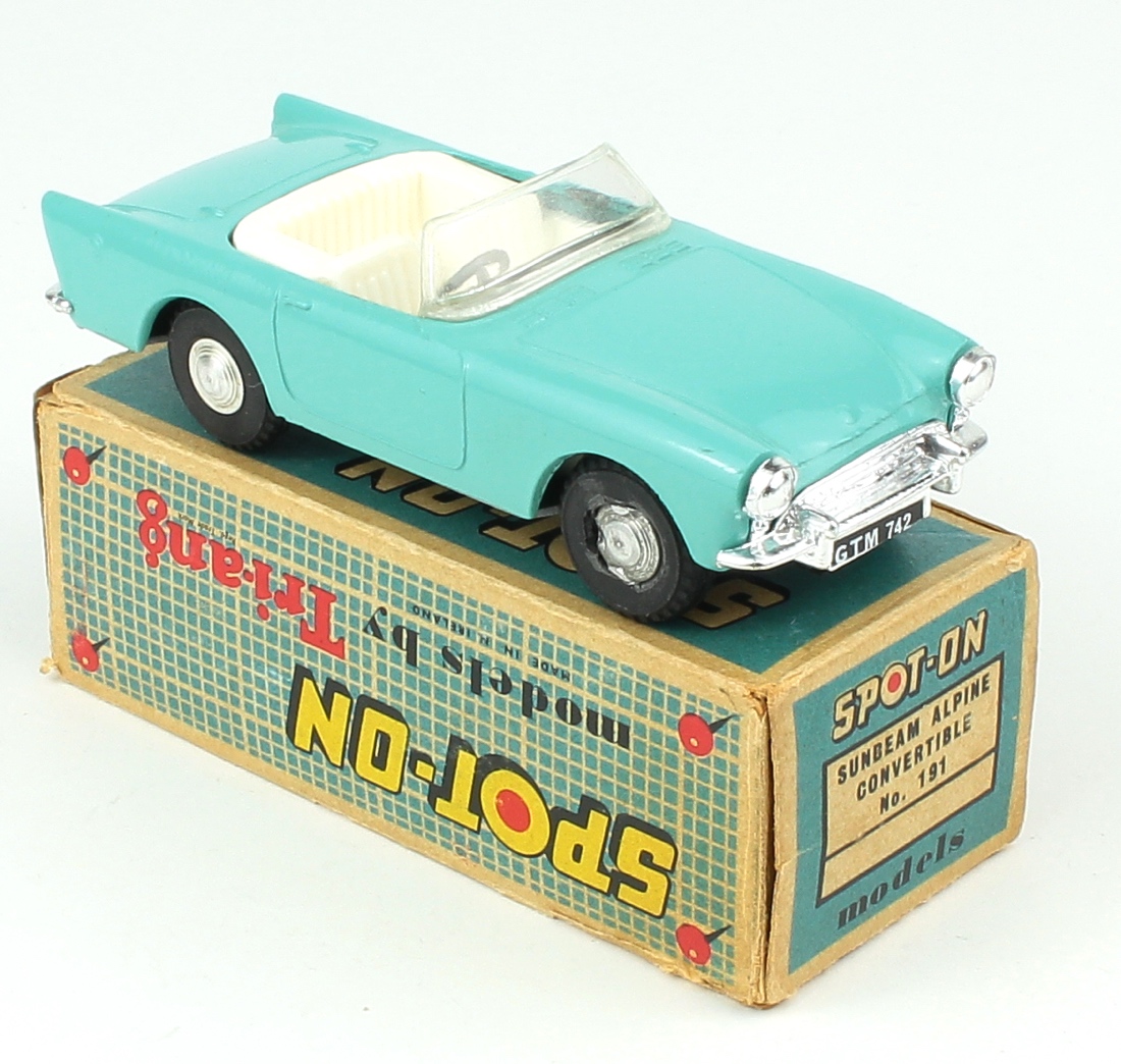 Spot-on 191 Sunbeam Alpine Convertible. TURQUOISE issue with WHITE interior. Scarce. Very near mint (wear to wheel)/boxed. From A Phenomenal Collection. QDT starting bid £175. Please note that QDT apply 12.5% buyer's commission.