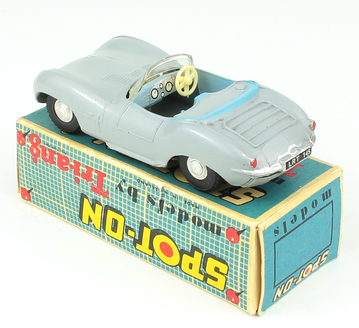 A rare issue, this Jaguar XK SS is missing from most Spot-on collections. All original light grey finish with attractive light blue seating and tonneau. Windscreen has a little dab of glue to secure into place. Number plates front and rear. Shining silver trim. Bright shaped spun wheels and well-shaped tyres.