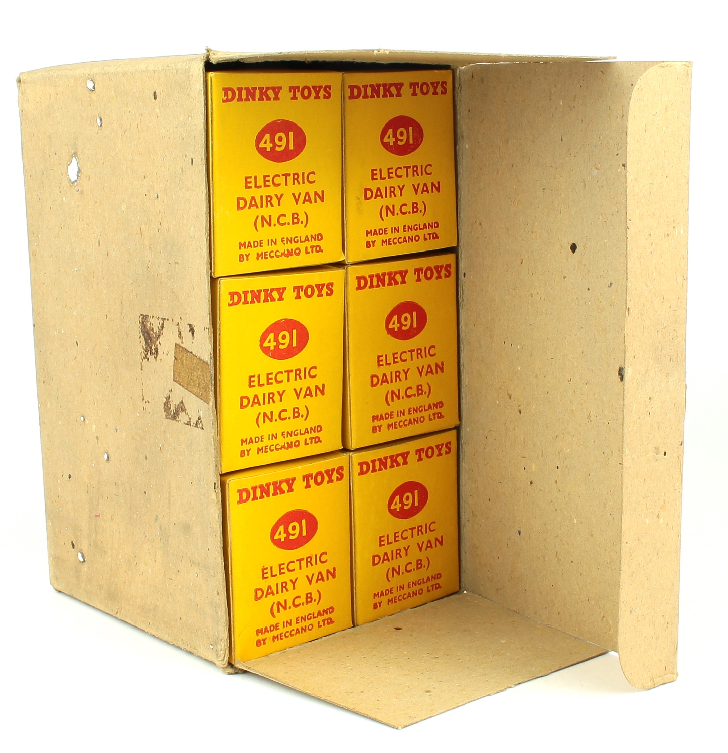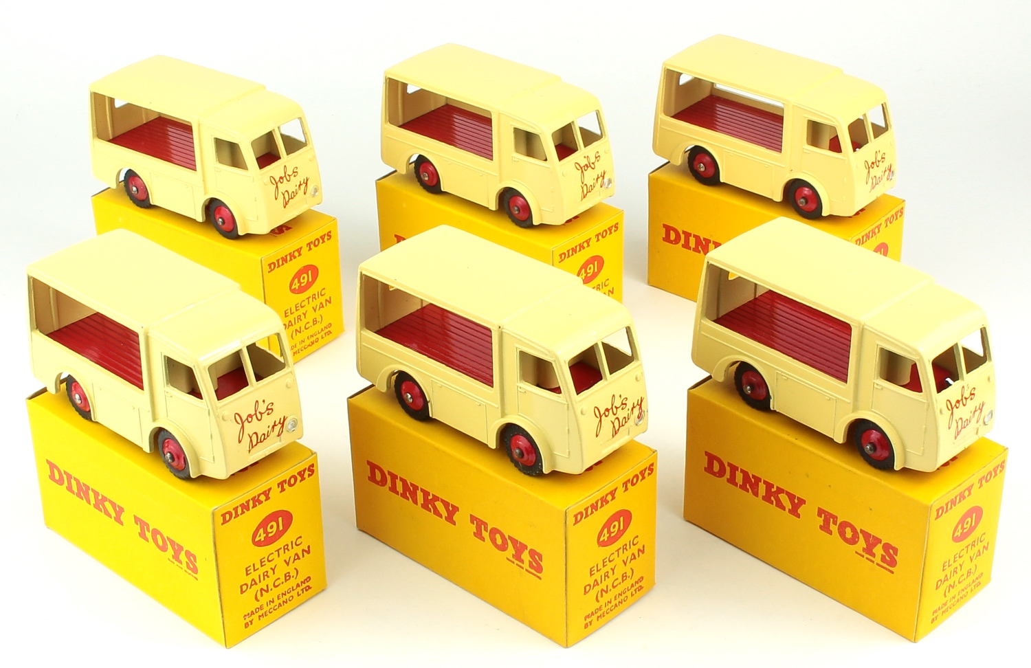 Old shop Trade Pack containing all six original Dinky 491 Electric Dairy Vans "Job's Dairy". Very, very near mint/boxed. Rare promotional Dinky models. Exceptional unsold item with super-crisp boxes.