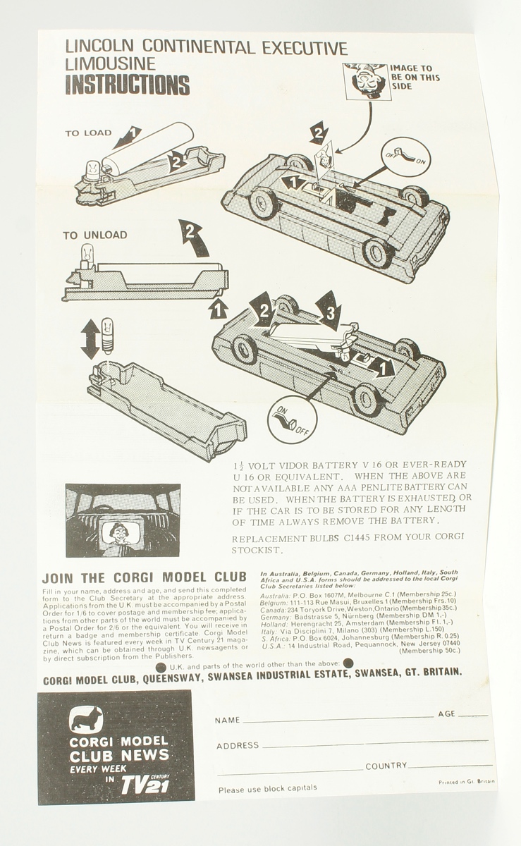 Includes the Instruction Leaflet which incorporates a Corgi Club Membership Form: