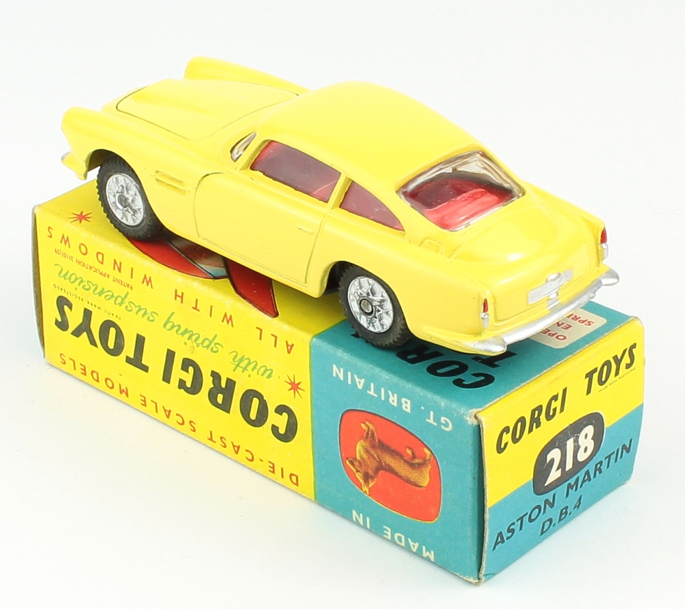 Corgi 218 Aston Martin DB4. Yellow, cast criss-cross wheels issue. Very near mint/boxed. Crisp box! From The Pennsylvanian Collection.