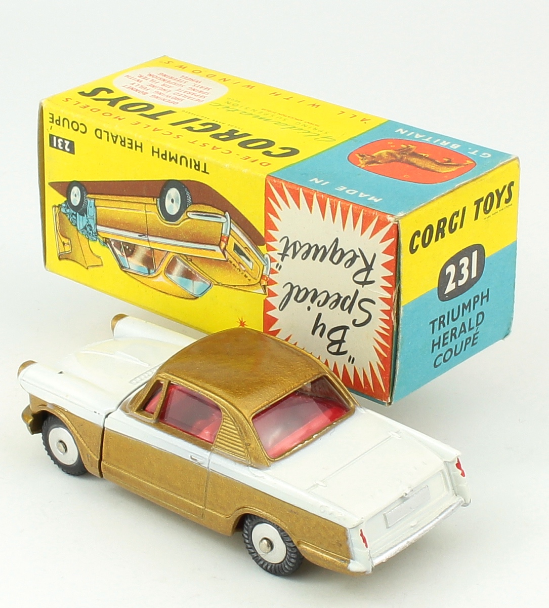 Triumph Herald Coupe by Corgi Toys, No 231. Very near mint/boxed. Gold and white version and a rare find with SHAPED SPUN WHEELS. With air filter. From The Rickman Collection. Starting bid £200. Please note that QDT apply 12.5% buyer's commission.