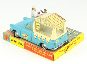 Issued between 1965-67, this sought-after Corgi Ford Thames Ice Cream Van has a shining, original blue and cream finish with complete detailed labels: Suspension on shaped spun wheels. In beautiful, very close to mint condition.Just the tiniest of rubs at a rear edge and very minor ‘misting’ to the windows.