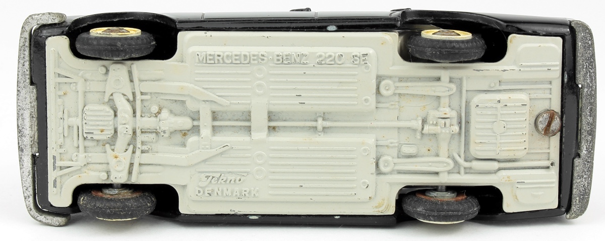 Gleaming black finish with a pale grey interior, this Tekno Mercedes 220 SE model has a close to mint paint finish, an intact bonnet emblem and white wall tyres (silver wheels). Original treaded tyres run well. Complete and bright ‘TAXI’ label.