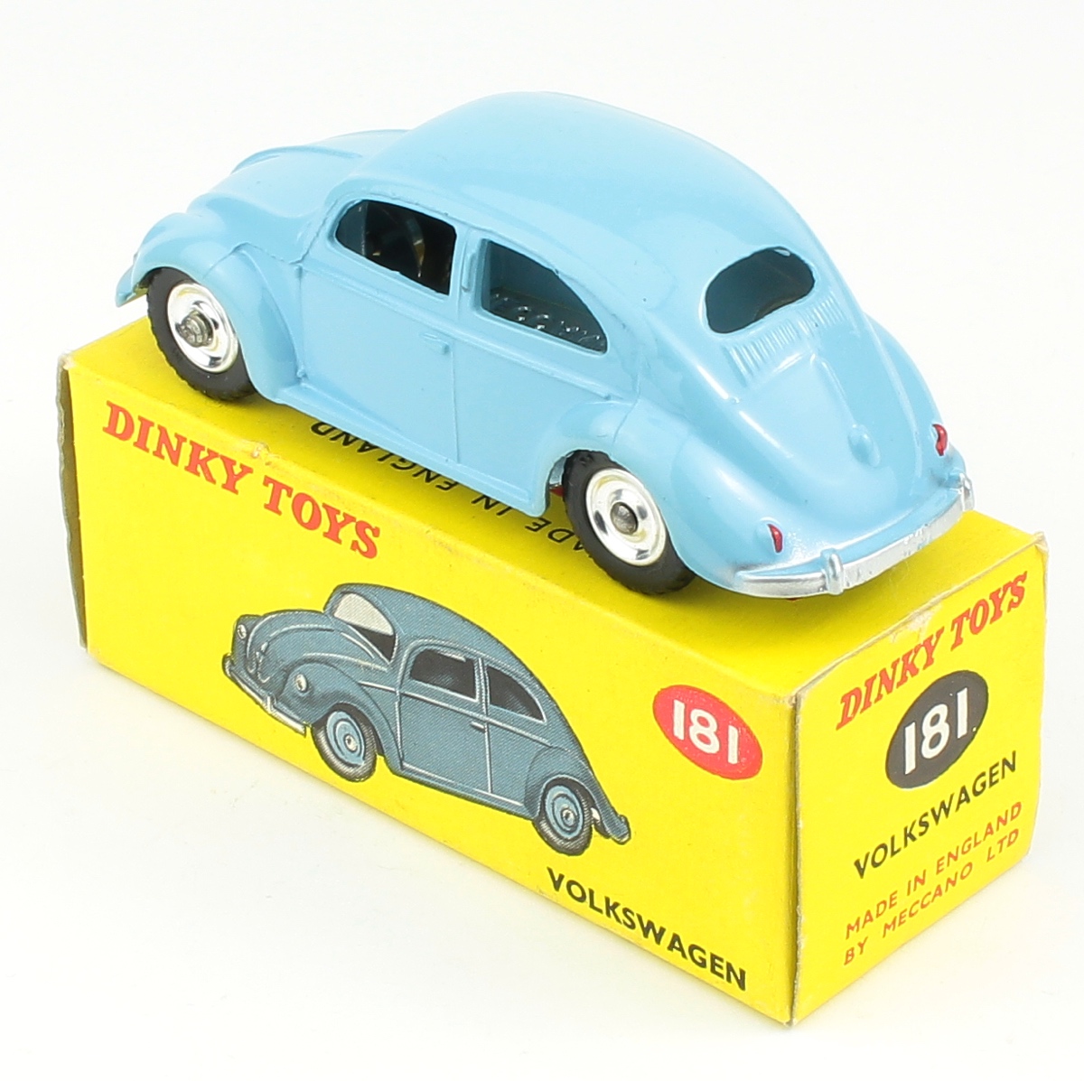 Dinky 181 Volkswagen. Sky blue version. Spun hubs and scarce chrome base. Very, very near mint/boxed. Harder to find box version WITHOUT colour spot detail. From The Berlin Collection.