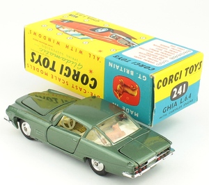 Corgi 241 Ghia L6.4. Very, very near mint/boxed. *METALLIC GREY-GREEN version with IVORY interior, SPUN wheels*. Scarce. Bright, fresh box. From The Eric Morris Collection.