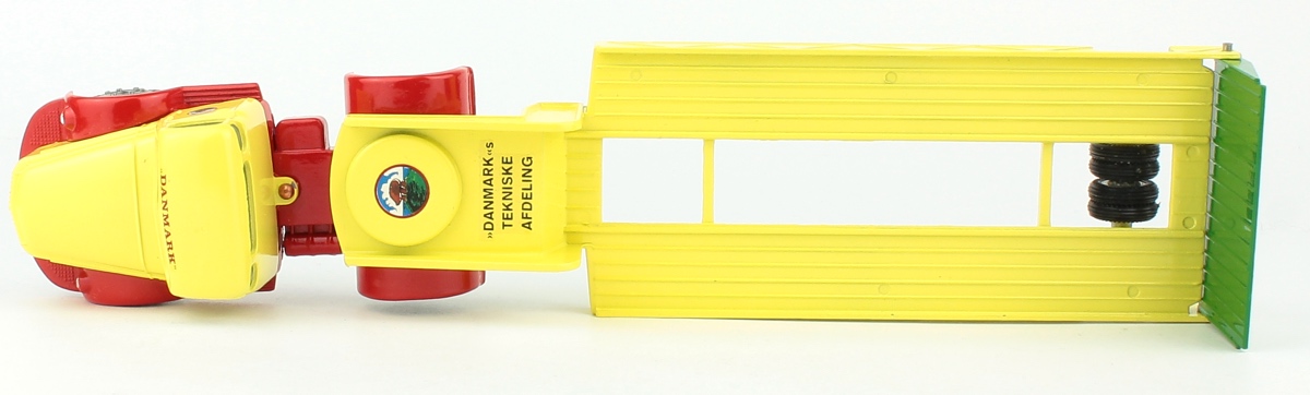 A fresh and bright articulated Volvo Low Loader Truck ‘DANMARK’ finished in lemon and red with a green tailgate. Detailed cast wheels, fine original tyres, window glazing & drop-down rear ramp. Shiny metal parts throughout. Complete ‘DANMARK’ transfers and colourful logo throughout. Headlights.