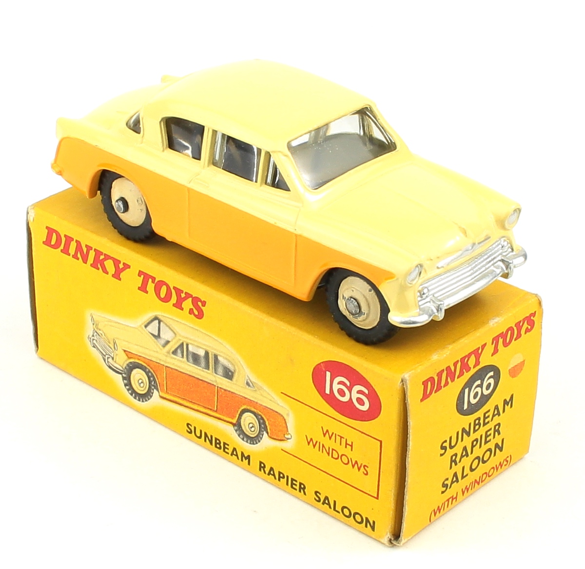 This classic Dinky car has a fresh and lustrous orange-yellow and cream paint finish with beige wheels: