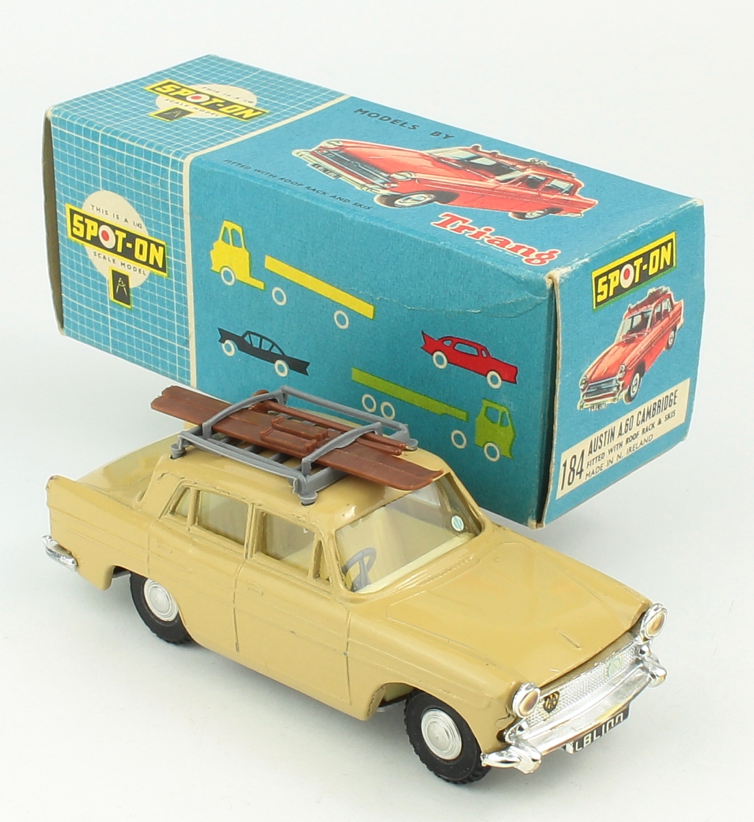 Issued during 1963 by the respected Spot-on manufacturer in strictly 1:42 scale. This version is fawn with a lemon-cream interior, intact grey roof rack with brown skis and poles.