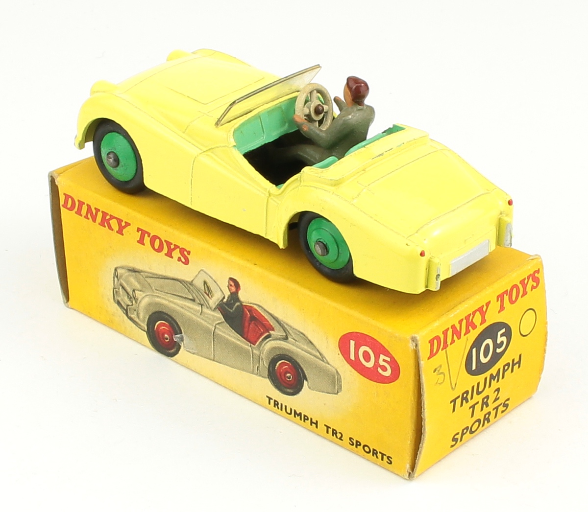 Dinky 105 Triumph TR2 Sports. Touring finish. Lemon with green cast wheels. Very near mint/boxed. From The West Midlands Collection.