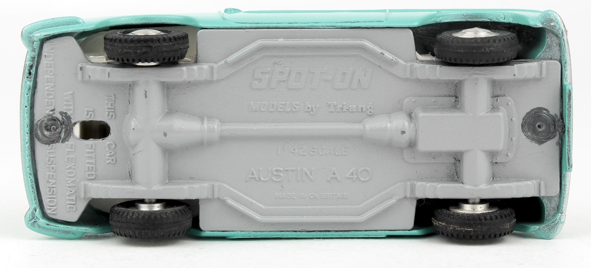 Issued during 1961, this Austin A40 model was available in several different colour finishes. Distinctive turquoise finish and a white interior on this fine model with shiny spun wheels ad well-shaped tyres.