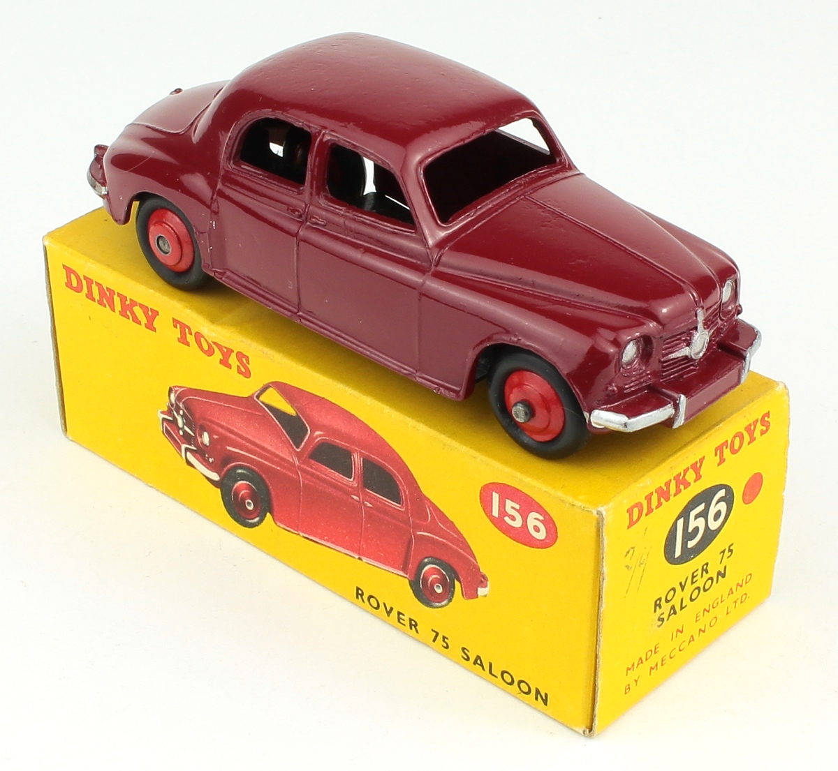 Dinky 156 Rover 75 Saloon. Maroon with red wheels version. Large print baseplate. Very, very near mint/boxed. Scarce. From The West Midlands Collection.