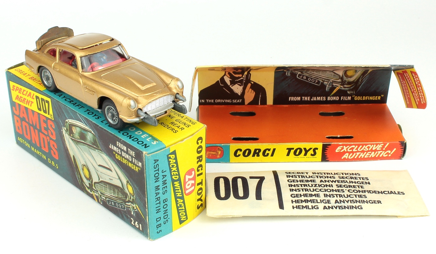 Corgi 261 James Bond's Aston Martin D.B.5. Bright gold issue. Very, very near mint/boxed. Stunning 1st issue WITH INDICATOR LIGHT CASTING. 1st issue style box with unopened Secret Instruction Packet. From The Eric Morris Collection.