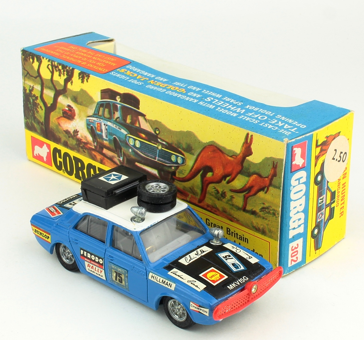 Corgi 302 Hillman Hunter Rally Car With Kangaroo. Version with 'GOLDEN' Golden Jacks. Very near mint/boxed. With leaflet. 2nd issue box version WITHOUT 302 printed on box face etc. From The Cheshire Collection.