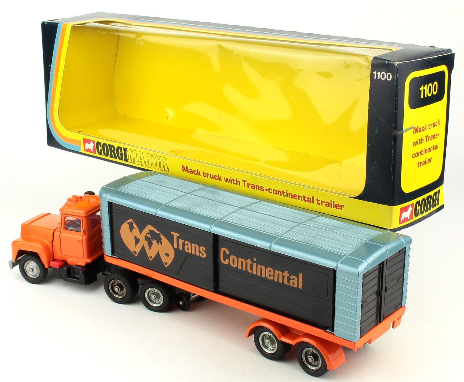 This Mack Truck and Trailer has a vibrant orange cab with a black, orange and blue trailer. Virtually complete-complete ‘TRANS-CONTINENTAL’ lettering and logo on both sliding doors of the trailer.