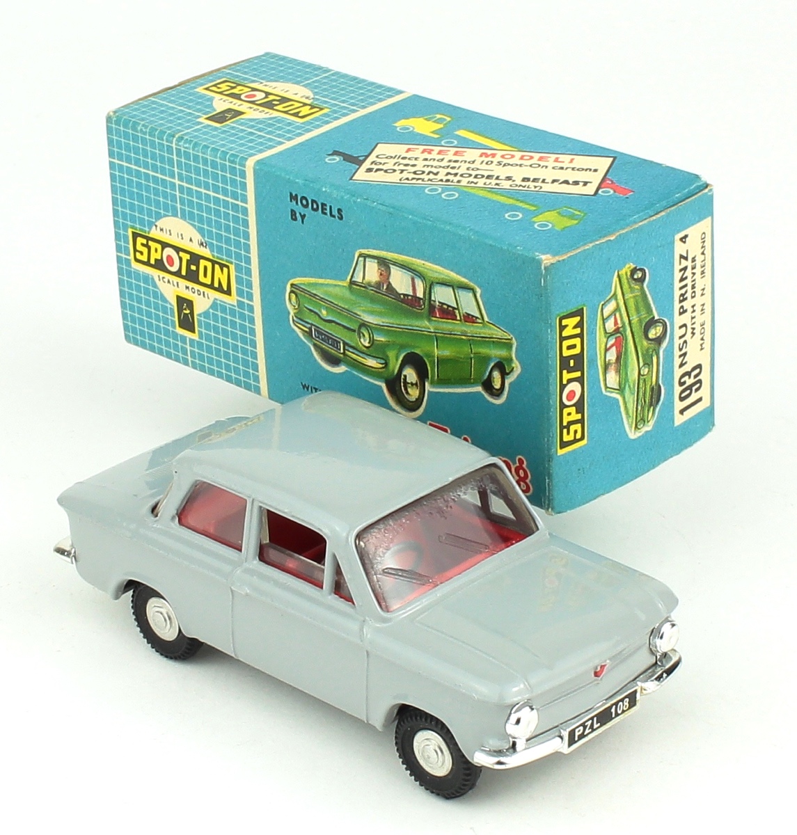 Spot-On 193 NSU Prinz 4 with driver. Scarce in grey, red seats. Very near mint/boxed. With driver & both Leaflets. Nice box! From A Phenomenal Collection. Starting bid £150. Please note that QDT apply 12.5% buyer's commission.