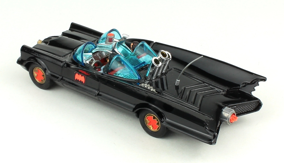 This early issue, gloss black Batmobile is in all original condition. An attractive high gloss original finish. Bright chrome at cockpit and launch tubes. Intact blue tinted glass. Intact aerial. Bright bat logos on the wheels, bright gold surround, and complete and bright Bat logos at both sides of the Batmobile. Suspension on all four wheels notably. Fine original tyres.