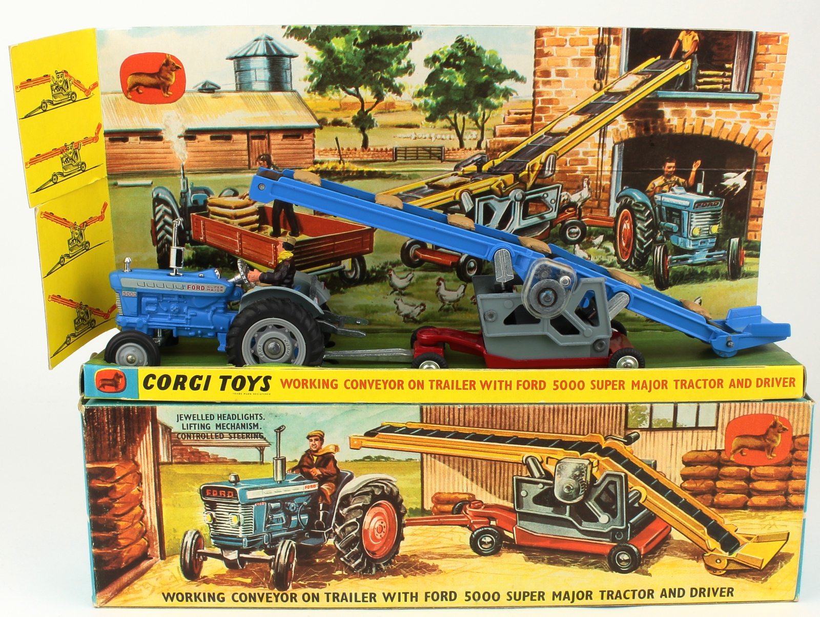 Corgi Toys Gift Set 47 Working Conveyor on Trailer with Ford 5000 Super Major Tractor & Driver. Version with CHROMED Chimney Stack. Near mint plus/boxed. From The Cheshire Collection.