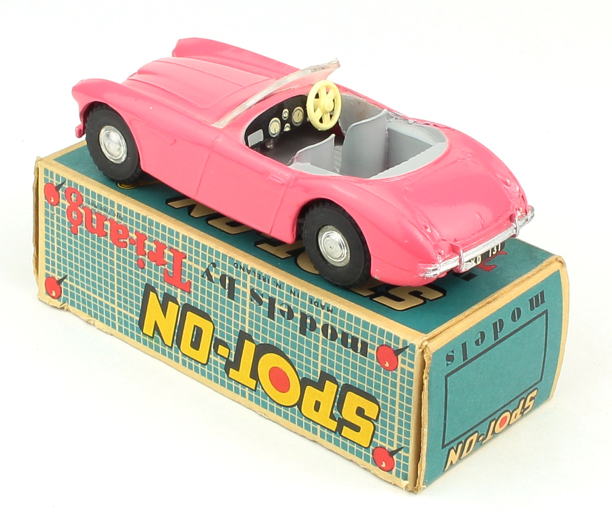 Spot-On 105/1 Austin-Healey "100-SIX". Scarce DEEP PINK version. Grey interior and a RED steering wheel. Very near mint/boxed. With Collector's Card. From A Phenomenal Collection.
