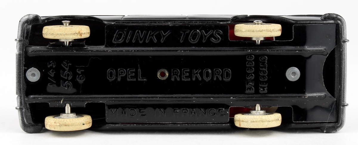 This is a scarce German export Opel Rekord ‘TAXI’ model in original condition, finished in black with chromed hubs, and original white tyres (with a light tread). Complete with roof Taxi sign with yellow lettering. Shiny black base with 554 61 stamped, as well as 1/43 scale. Presents nicely with a sleek black finish.