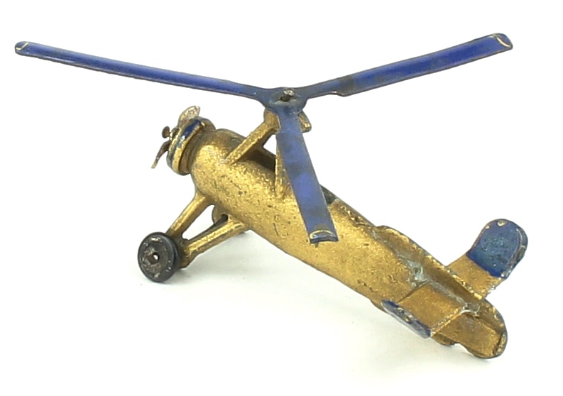 A survivor from the earliest period of Dinky Toys. Available from a Dinky Toys Shopkeeper’s Trade Box during the period 1934-36. In original and complete condition, this Cierva Autogiro is finished in gold with blue rotors and trim. Correct that this 1st issue does not have a pilot (later issue would have a pilot cast-in).