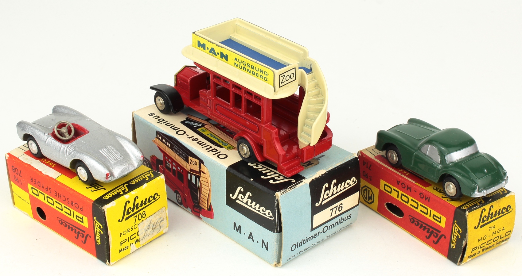 3 x Schuco Models: Piccolo No. 708 Porsche Spyder, Piccolo 714 MGA & 776 Oldtimer Omnibus. Very, very near mint - mint/boxed. A pleasing trio from The QDT Vault. Starting bid £50. Please note that QDT apply 12.5% buyer's commission.