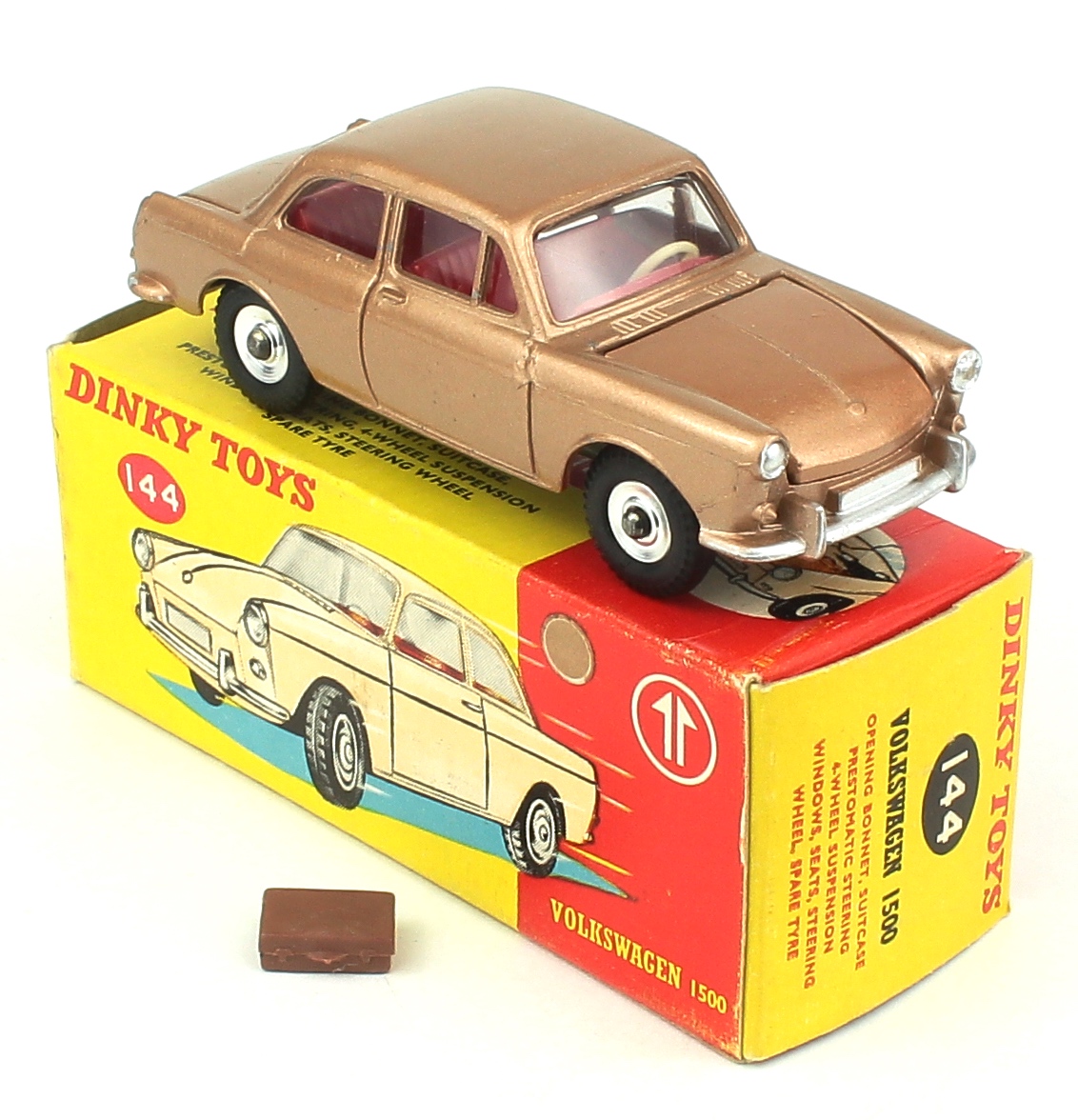 Volkswagen 1500 by Dinky Toys, No. 144. Very near mint /boxed. Scarce bronze issue with RED interior. Suitcase. From The West Midlands Collection.