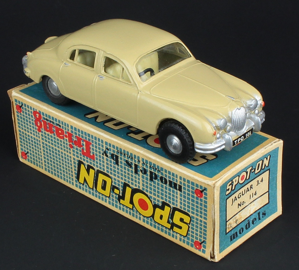 Jaguar 3.4 Mark 1 Saloon by Spot-on Models, No. 114 . A First for QDT in BEIGE!. Very near mint/boxed. From A Phenomenal Collection. QDT starting bid £175. Please note that QDT apply 12.5% buyer's commission.