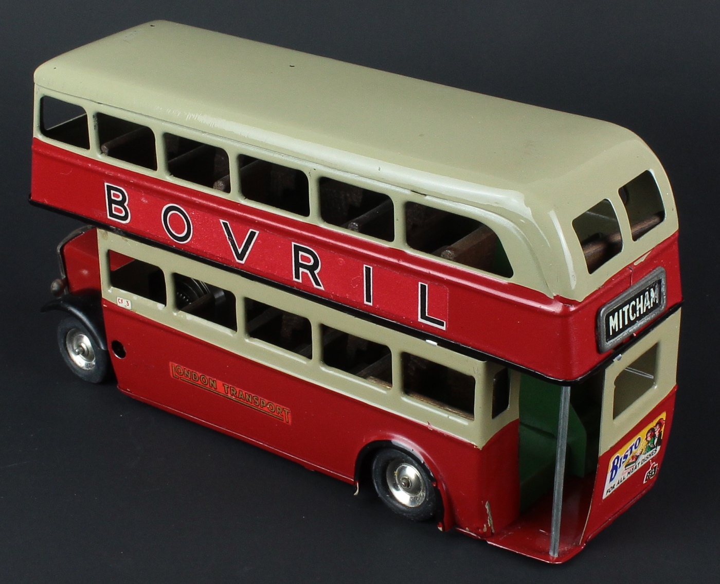 Issued during 1939, this early issue Double-Decker Bus presents well with a smart maroon. stone and black finish with complete ‘BOVRIL’ and ‘OVALTINE’ advertisements on both sides, complete colourful BISTO advert at the rear. ‘Mitcham’ destination with registration LBL 174.