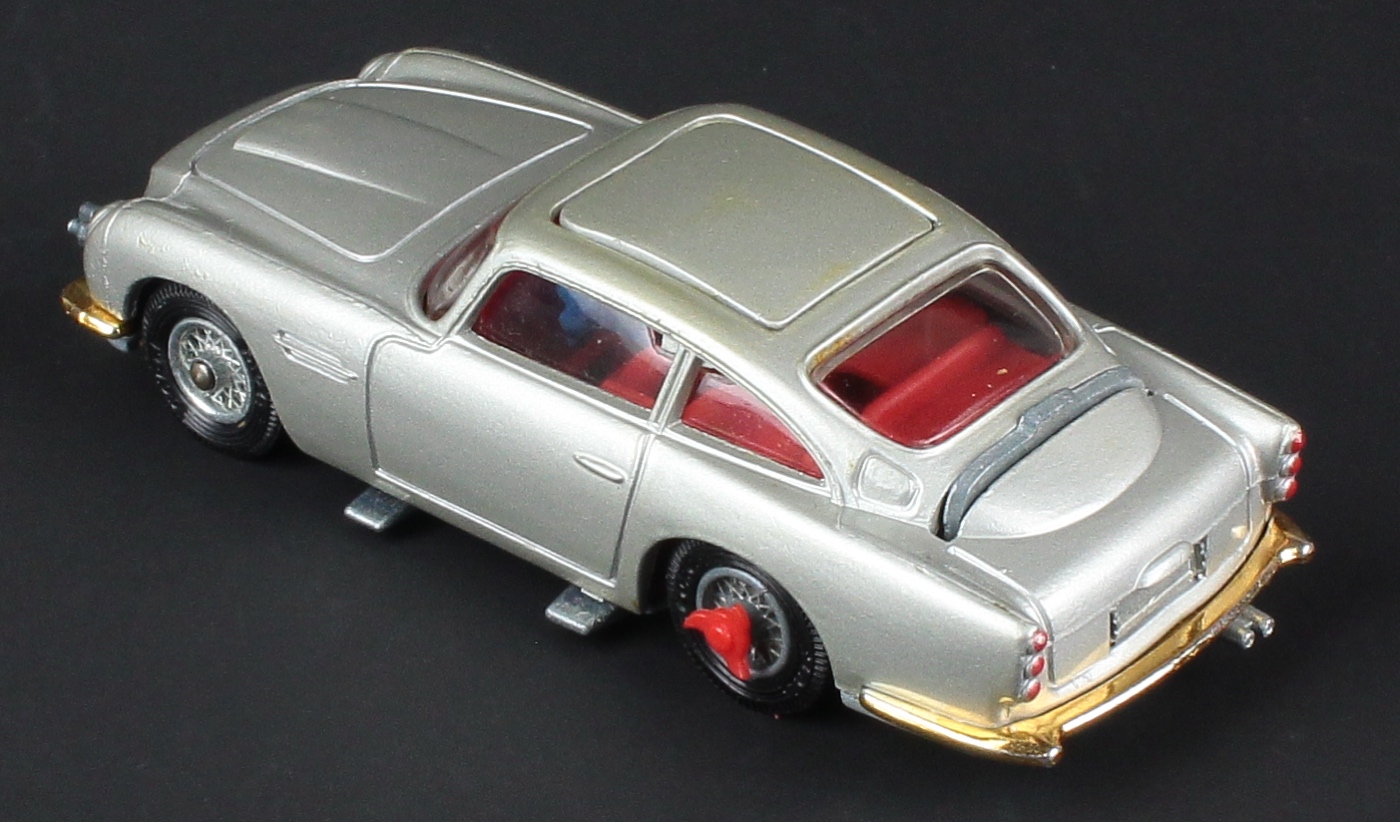 This sought-after James Bond Aston Martin model is in totally original condition. The silver Aston Martin with gold bumpers has the opening roof feature with the ejector seat mechanism functioning. Both figures of James Bond and villain are still seated inside. It has the rear bullet screen which can be raised and lowered, telescopic over-riders, retractable machine guns, revolving number plates and of course the red tyre slasher blades on the rear wheels. Original tyres look as-new. The suspension is fine on three of the detailed spoked wheels. Still sits well.