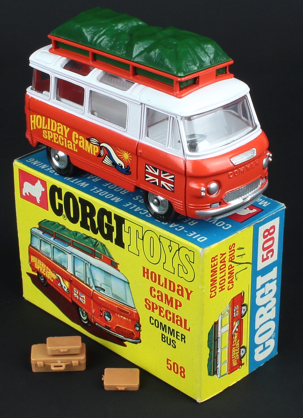 Commer Holiday Camp Bus by Corgi Toys, No. 508. Very near mint/boxed. Complete with all three suitcases. From The Eric Morris Collection.