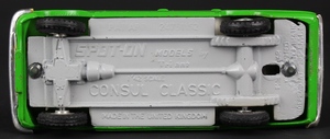 Issued during 1963. Pea-green finish with a white interior on this rare Consul Classic model. Virtually complete – complete number plates front and rear. Shiny spun wheels and well-shaped original tyres.