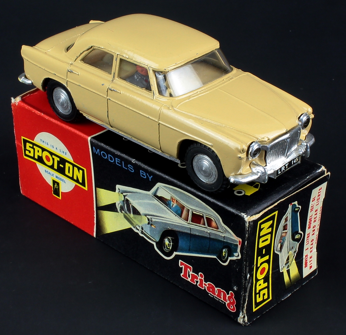 Rover 3 Litre by Spot-on Models, No. 157/SL. Rare in light CARAMEL, matching interior, black steering wheel, with driver figure. Later issue with lighting fitment. Near mint/boxed (picture version). With Instruction Leaflet, promotional leaflet and Collector's Card. From A Phenomenal Collection. Starting bid £175. Please note that QDT apply 12.5% buyer's commission.