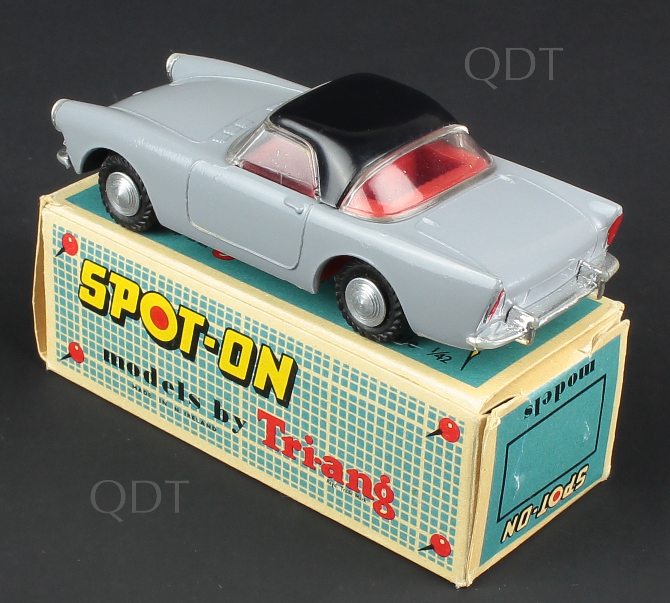 Sunbeam Alpine Convertible by Spot-on Models, No. 191/1. Mid-grey issue with red interior, cream steering wheel & black hood. with herringbone tyres. Scarce. Another 'First for QDT'. Very near mint (a little chrome loss)/boxed. From A Phenomenal Collection. QDT starting bid £250. Please note that QDT apply 12.5% buyer's commission.
