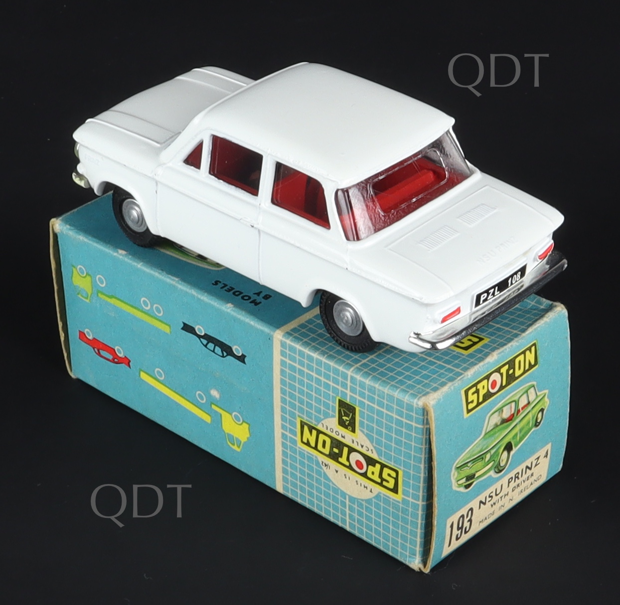 NSU Prinz 4 with driver by Spot-on Models, No. 193. Scarce in WHITE, red seats. Very near mint/boxed. With driver. From A Phenomenal Collection. Starting bid £200. Please note that QDT apply 12.5% buyer's commission.