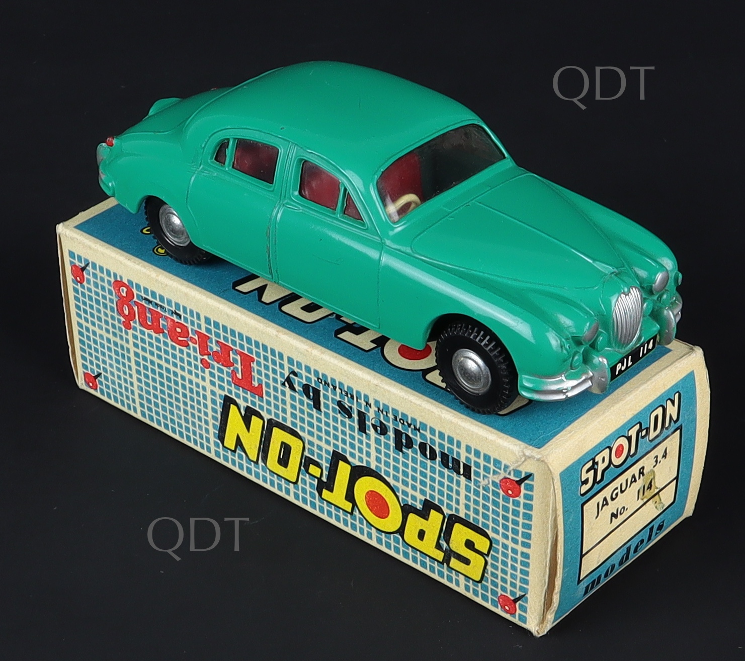 Jaguar 3.4 Mark 1 Saloon by Spot-on Models, No. 114 . Scarce in DEEP SEA-GREEN, red interior, deep grey base. Very near mint/boxed (with green colour spot). With Collector's Card, promotional leaflet and sheet of transfers. From A Phenomenal Collection. QDT starting bid £200. Please note that QDT apply 12.5% buyer's commission.