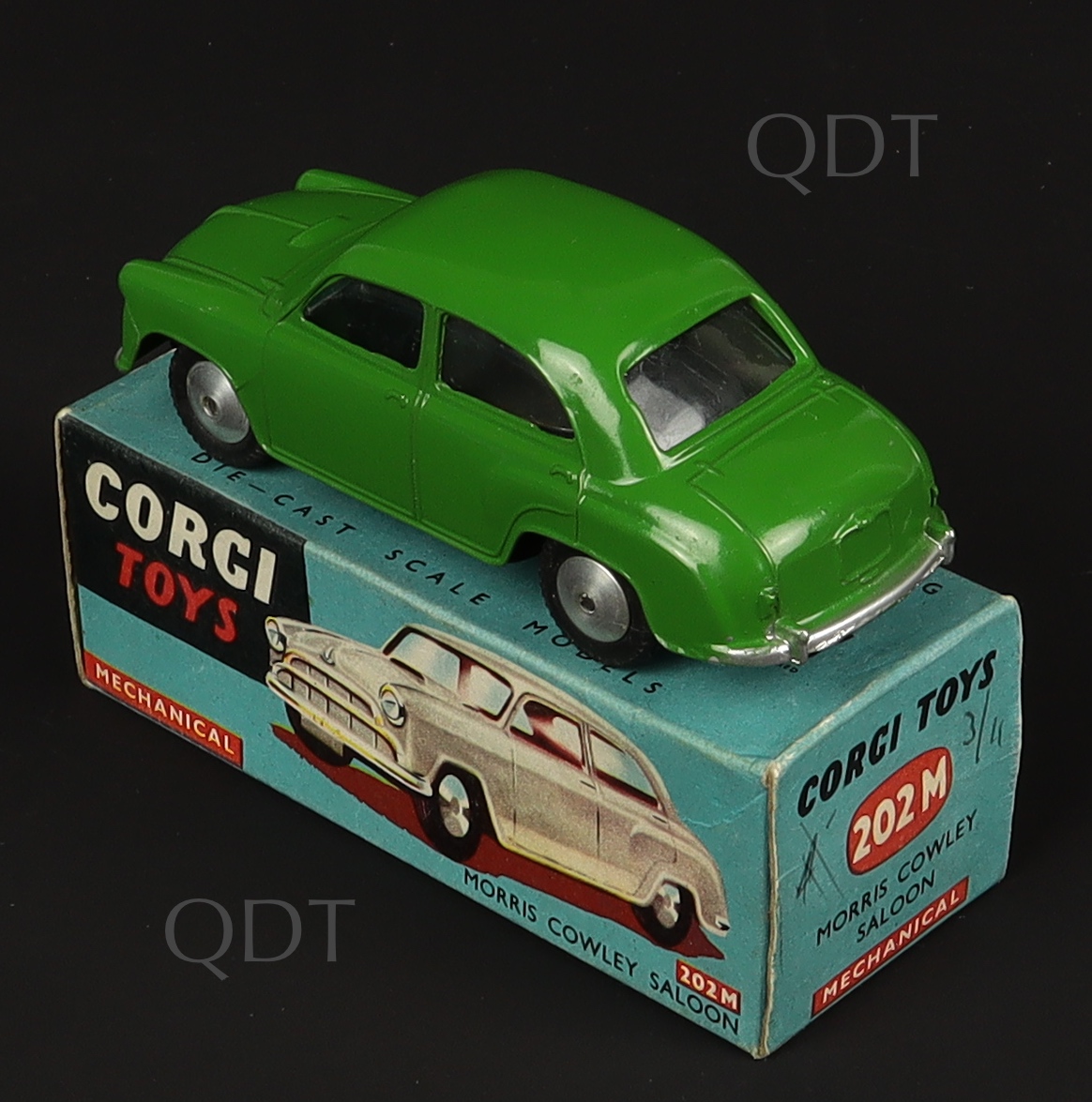 Morris Cowley Saloon by Corgi Toys, No. 202M. Rich, mid-green issue. Very, very near mint/boxed. From The West Midlands Collection.