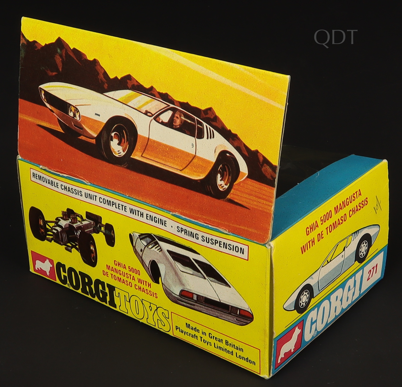 Ghia 5000 Mangusta with De Tomaso Chassis by Corgi Toys, No. 271. Very, very near mint, WITH INTACT AERIAL/boxed, with ORIGINAL DETACHABLE HEADER CARD. From The Borders Collection. Starting bid £300. Please note that QDT apply 12.5% buyer's commission.